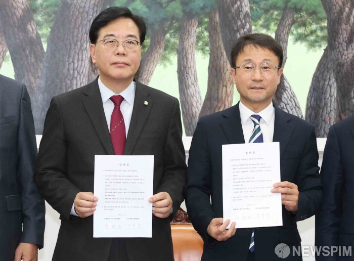 한병도 더불어민주당 원내대표와 송언석 국민의힘 원내대표가 지난 4일 서울 여의도 국회에서 미국 관세 재인상과 관련한 대미투자특별법 처리를 위한 특별위원회를 구성하기로 합의 후 기념촬영을 하고 있다. [사진=뉴스핌DB] |