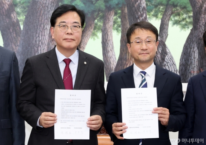 (서울=뉴스1) 이승배 기자 = 한병도 더불어민주당 원내대표와 송언석 국민의힘 원내대표가 4일 서울 여의도 국회에서 미국의 관세 재인상과 관련해 대미투자특별법 처리를 위한 특별위원회를 구성하기로 합의 후 합의문을 들고 기념촬영하고 있다. 여야는 그동안 이견을 좁히지 못한 2월 임시국회 본회의 일정과 관련해 국민의힘 요구대로 12일 본회의를 개최하고 여야 합의된 법안을 처리하기로 했다. 2026.2.4/뉴스1 Copyright (C) 뉴스1. All rights reserved. 무단 전재 및 재배포, AI학습 이용 금지. /사진=(서울=뉴스1) 이승배 기자 |