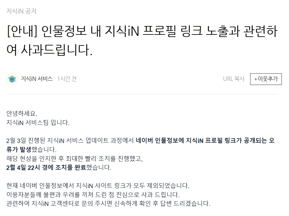 네이버는 이날 지식인 공식 블로그에서 “해당 현상 인지 후 최대한 빨리 조치했다”며 이같이 전했다. 이어 “지식iN 서비스팀은 같은 문제가 다시 발생하지 않도록 관련 설정과 타 서비스와의 연결 프로세스 전반을 점검하고 있다”며 “서비스 안정을 위해 더욱 노력하겠다”고 덧붙였다.