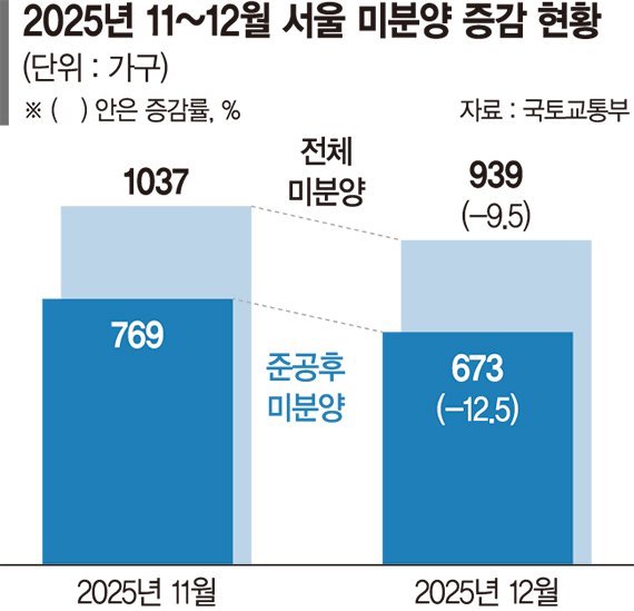 5일 국토교통부 주택통계에 따르면 지난해 12월 서울 아파트 미분양 물량은 939건으로 전월(1037가구) 대비 9.5%(98가구) 감소했다. 이 중 준공 후 미분양 물량은 673건으로 전월(769가구) 대비 12.5%(96가구) 급감했다. 한 달 동안 약 100가구가 사라진 셈이다.
