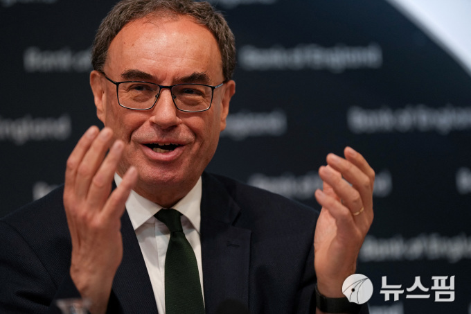 앤드루 베일리 영란은행(BOE) 총재가 8일(현지시간) 통화정책회의 결과를 설명하고 있다. [사진=로이터 뉴스핌] |