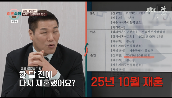 이후 부부는 2023년 6월 정식 이혼했으나, 약 2년의 공백기를 거쳐 2025년 10월 재결합했다. 이를 들은 서장훈은 “결혼 4년 차인데 실질적으로 같이 산 기간은 4개월 남짓인 거냐”며 황당함을 감추지 못했다.