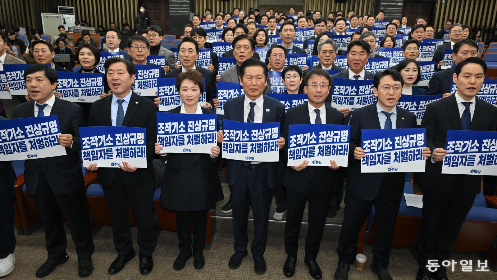 더불어민주당 정청래 대표(앞줄 가운데)와 의원들이 5일 서울 여의도 국회에서 열린 의원총회에 앞서 검찰의 조작 기소를 규탄하는 피켓을 들고 구호를 외치고 있다. 앞줄 왼쪽부터 이성윤 황명선 이언주 최고위원, 정 대표, 한병도 원내대표, 천준호 원내운영수석부대표, 김한규 원내정책수석부대표. 장승윤 기자 tomato99@donga.com |