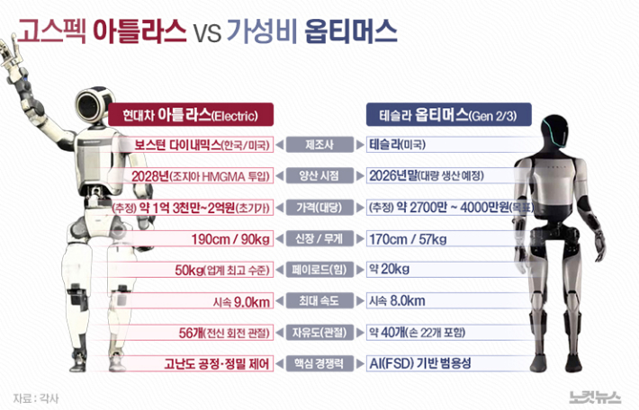 6일 CBS노컷뉴스 취재를 종합하면 현대차그룹의 로봇 계열사 보스턴 다이내믹스가 개발한 차세대 휴머노이드 로봇 '아틀라스'는 고난도 공정에 특화된 모델이다. 아틀라스는 인간과 유사한 56개의 관절을 기반으로 페이로드(들어 올리는 무게)가 50㎏에 달한다. 경쟁 모델인 옵티머스보다 2배 이상 강력하다. 백덤블링까지 한 뒤 자세를 바로 잡는 아틀라스의 모습은 최근 세계 최대 가전·IT 전시회 CES에서 공개되며 많은 이들을 놀라게 했는데, 그만큼 정밀한 하드웨어 제어 능력은 세계 최고 수준으로 평가받는다.