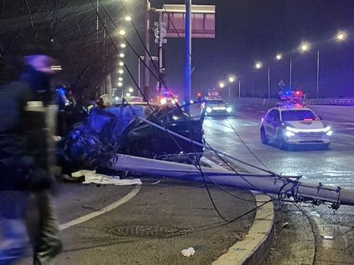 사고 충격에 전봇대가 부러지고 승용차 앞부분이 형체를 알아보기 힘들 정도로 부서졌다.