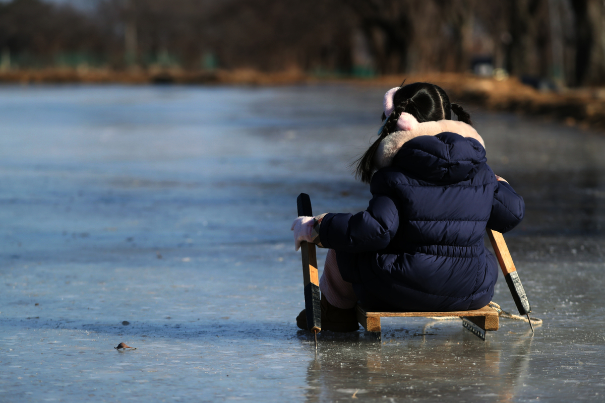 지난달 27일 강원 속초시 도문동에서 한 어린이가 얼음 썰매를 체험해 보고 있다. |