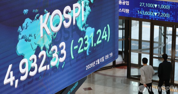 [서울=뉴스핌] 이형석 기자 = 코스피 지수가 6일 4% 넘게 하락하며 매도 사이드카가 발동됐다. 서울 여의도 한국거래소에 코스피 지수가 표시되고 있다. 2026.02.06 leehs@newspim.com |
