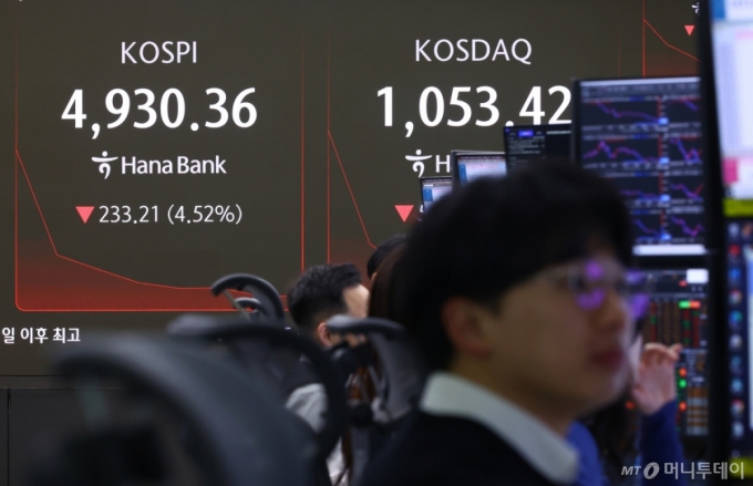 6일 오전 9시25분 현재 코스피는 전날 대비 226.33포인트(4.38%) 내린 4937.25를 나타내고 있다. 이날 하락 출발한 코스피는 장 중 낙폭을 벌리고 있다.