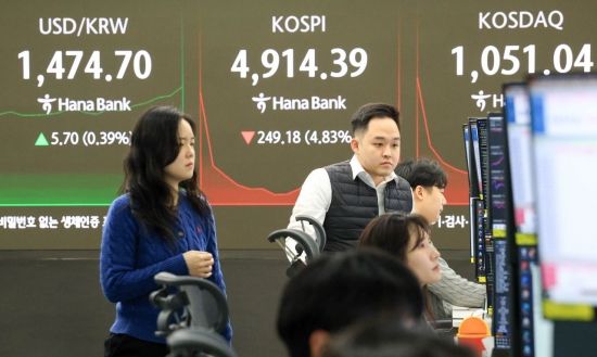 코스피 지수가 장중 5000선을 붕괴하며 나흘 만에 매도 사이드카가 발동된 6일 서울 중구 하나은행 딜링룸에서 딜러들이 업무를 보고 있다.