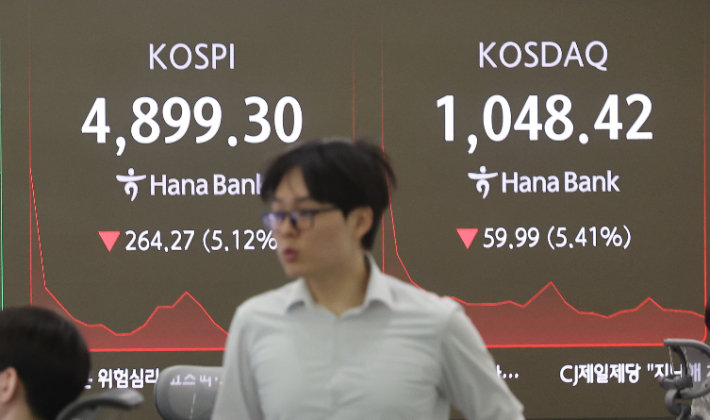 하지만 하락세가 지속되며 한때 5.12% 급락한 4899.3을 기록했다. 코스피가 4900선을 내준 것은 지난달 27일 이후 처음이다.