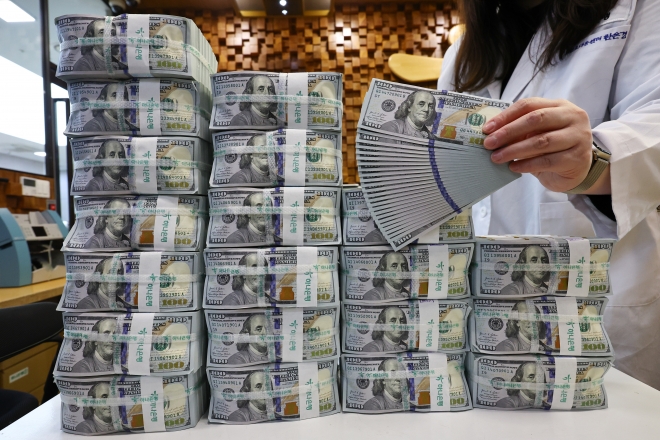 한국은행에 따르면 1월 말 기준 우리나라 외환보유액은 4259억1000만 달러로 한 달 전보다 21억5000만 달러 감소한것으로 나타난 4일 서울 중구 하나은행 위변조대응센터에서 직원이 달러를 정리하고 있다. 뉴시스 |