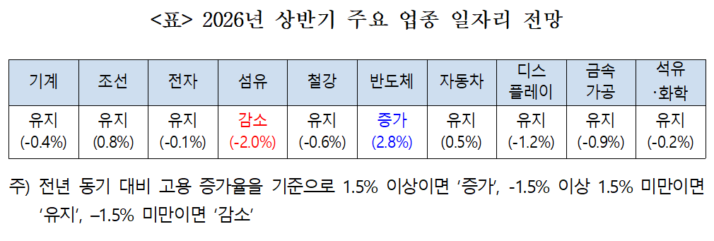 한국고용정보원은 “2026년 상반기 제조업 고용은 업종별로 차이는 있으나 전반적으로 감소 흐름이 이어질 가능성이 크다”며 “감소 폭이 축소됐다는 점은 긍정적 신호일 수 있지만, 이를 고용 증가나 본격적인 회복으로 해석하기는 어렵다”고 설명했다.