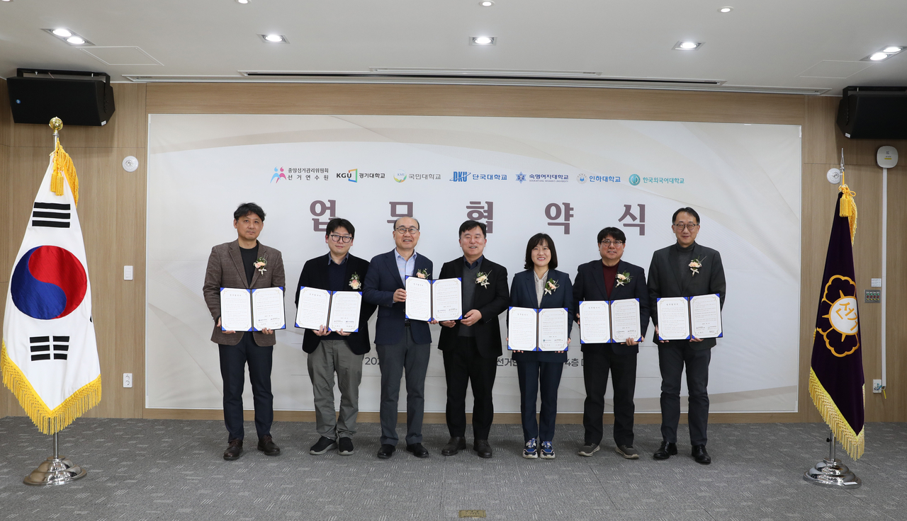 [헤럴드경제=양대근 기자] 중앙선거관리위원회 선거연수원(이하 선거연수원)은 6일 경기대학교, 국민대학교, 단국대학교, 숙명여자대학교, 인하대학교 및 한국외국어대학교와 선거·정치 교육을 내용으로 하는 학점인정 정규 교과목 개설을 위한 업무협약을 체결했다고 밝혔다.
