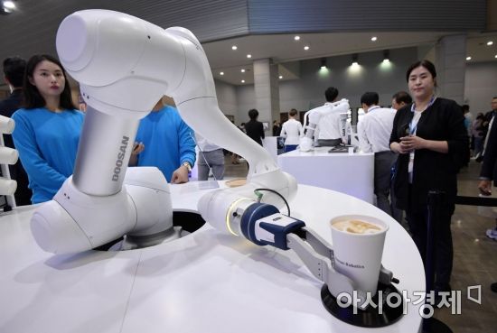22일 경기 고양시 킨텍스에서 열린 '2019 한국산업대전'에서 두산로보틱스가 바리스타 로봇을 선보이고 있다./고양=김현민 기자 kimhyun81@ |