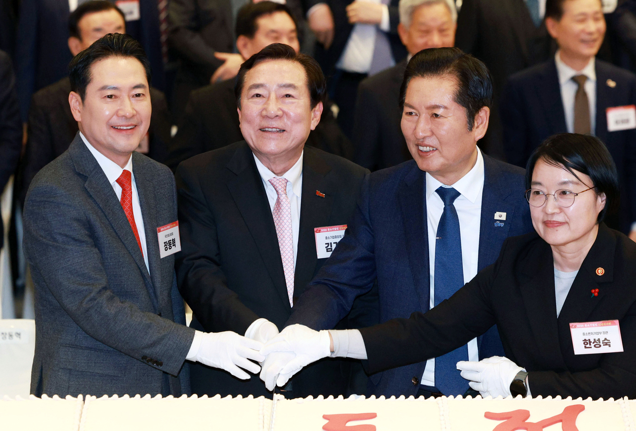 장동혁(왼쪽부터) 국민의힘 대표, 김기문 중소기업중앙회장, 정청래 더불어민주당 대표, 한성숙 중소벤처기업부 장관이 지난달 13일 서울 여의도 중소기업중앙회에서 열린 2026년도 중소기업인 신년인사회에서 떡케이크를 자르고 있다. 임세준 기자 |