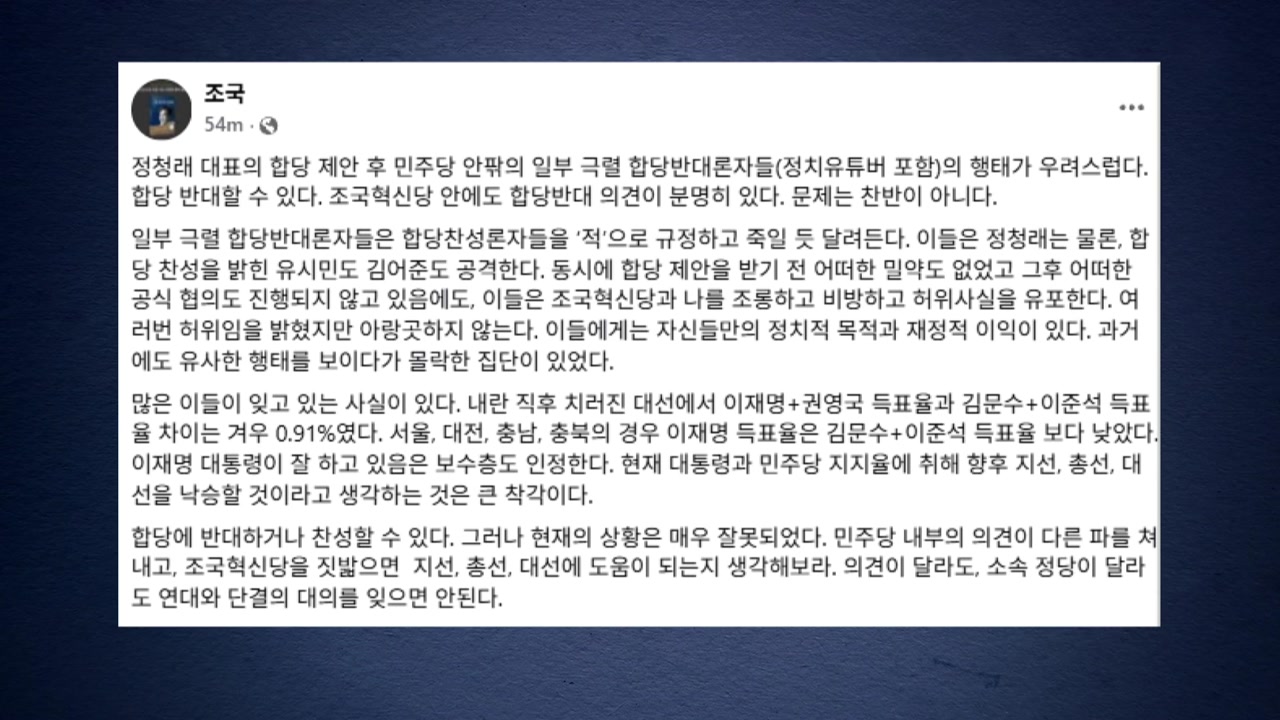 조 대표는 오늘(7일) 자신의 SNS에 정청래 대표의 합당 제안 뒤 민주당 안팎의 일부 극렬 합당 반대론자들의 행태가 우려스럽다며 이같이 밝혔습니다.