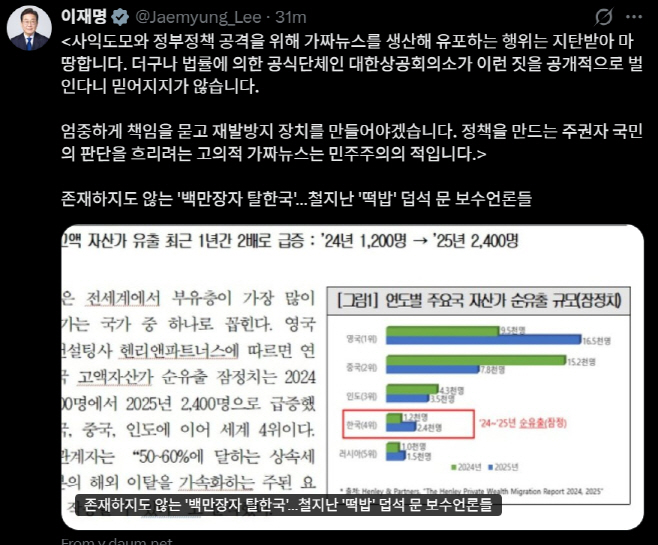 이 대통령은 7일 엑스(X·구 트위터)에 한 언론이 게재한 '존재하지도 않는 백만장자 탈환국…철지난 떡밥 덥석 문 보수언론들' 기사를 링크하며 이 같이 밝혔다.