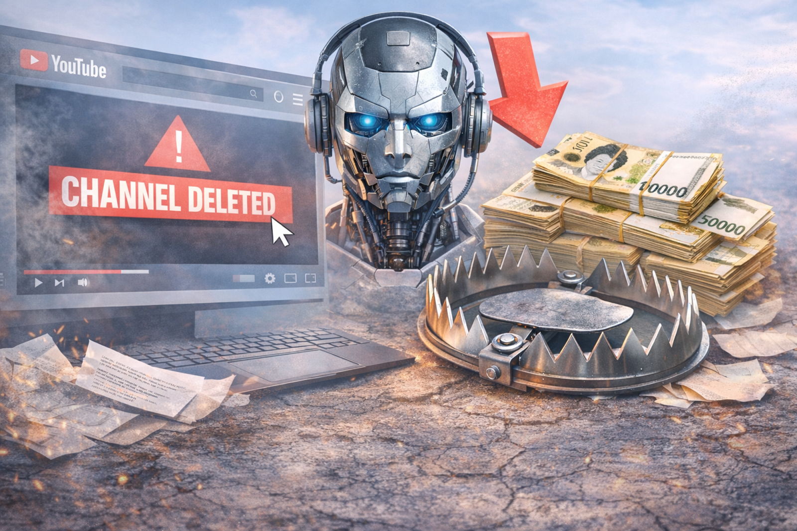 유튜브 화면에 ‘CHANNEL DELETED’ 경고가 표시된 이미지와 인공지능을 상징하는 그래픽. 플랫폼이 저품질 AI 콘텐츠에 대한 단속과 수익 구조 재편에 나서고 있음을 시각적으로 표현했다. 일러스트=챗GPT AI 생성 |