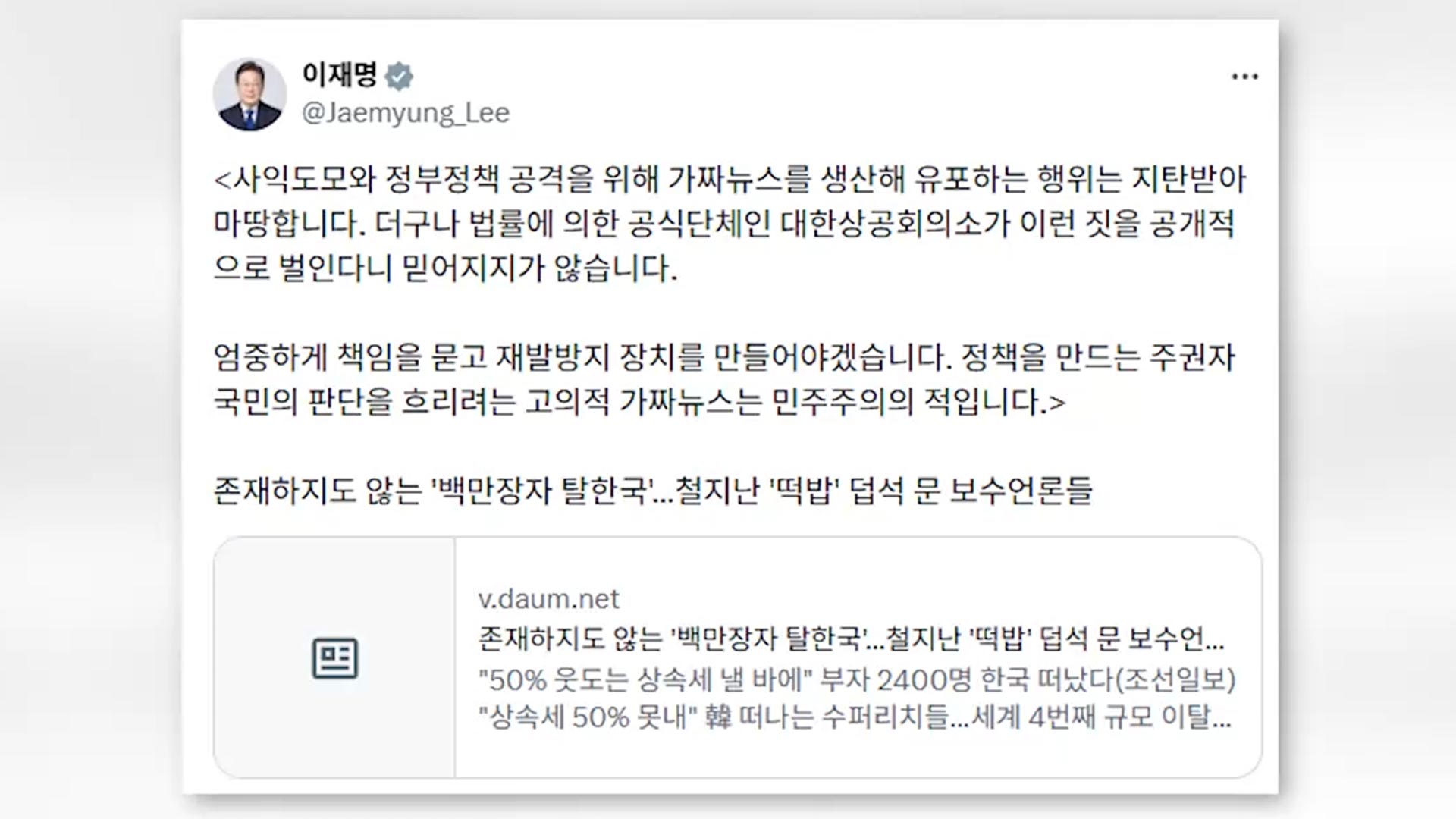 이 대통령은 오늘(7일) SNS에 한 언론이 게재한 '존재하지도 않는 백만장자 탈한국…철 지난 떡밥 덥석 문 보수언론들'이라는 기사를 링크하며 "사익도모와 정부정책 공격을 위해 가짜뉴스를 생산해 유포하는 행위는 지탄받아 마땅하다"고 썼습니다.