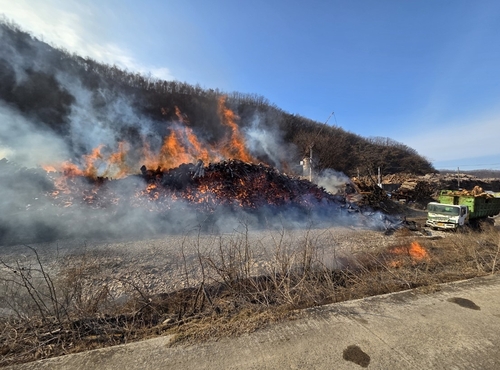 소방 당국은 적재된 나무가 많아 완전한 진화까지는 시간이 다소 걸릴 것으로 보고 있습니다.