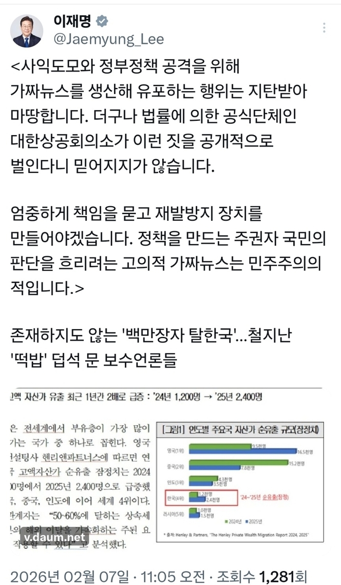 해당 연구에는 지난해 한국을 떠난 고액 자산가가 2천400명으로 전년 대비 2배로 급증하는 등 세계에서 4번째로 많다는 내용이 실렸는데, 조사 주체가 외국의 이민 컨설팅 업체인 데다 조사 방식도 부실해 믿기 어렵다는 게 칼럼의 논지다.