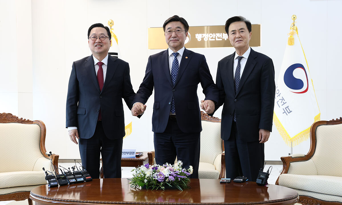 김태흠 충남도지사는 6일 이장우 대전시장과 함께 정부세종청사를 찾아 윤호중 행정안전부 장관을 만나 대전·충남 행정통합과 관련한 간담회를 가졌다. 전날 국회에서 민주당 한병도 원내대표와 국민의힘 장동혁 대표 등 여야 지도부를 잇따라 만난 데 이어, 이틀 연속 중앙 정무 일정을 소화했다.