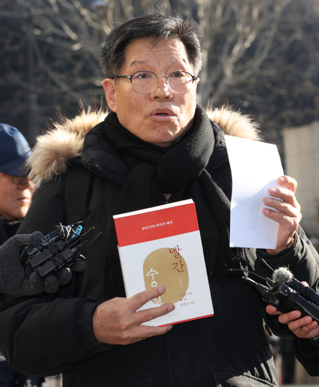 ▲일본군 '위안부' 피해자를 모욕하는 시위를 벌여온 혐의를 받는 김병헌 위안부법폐지국민행동 대표가 3일 서울 서초경찰서에 피의자 신분으로 출석하며 취재진의 질문에 답하고 있다. ⓒ연합뉴스 |