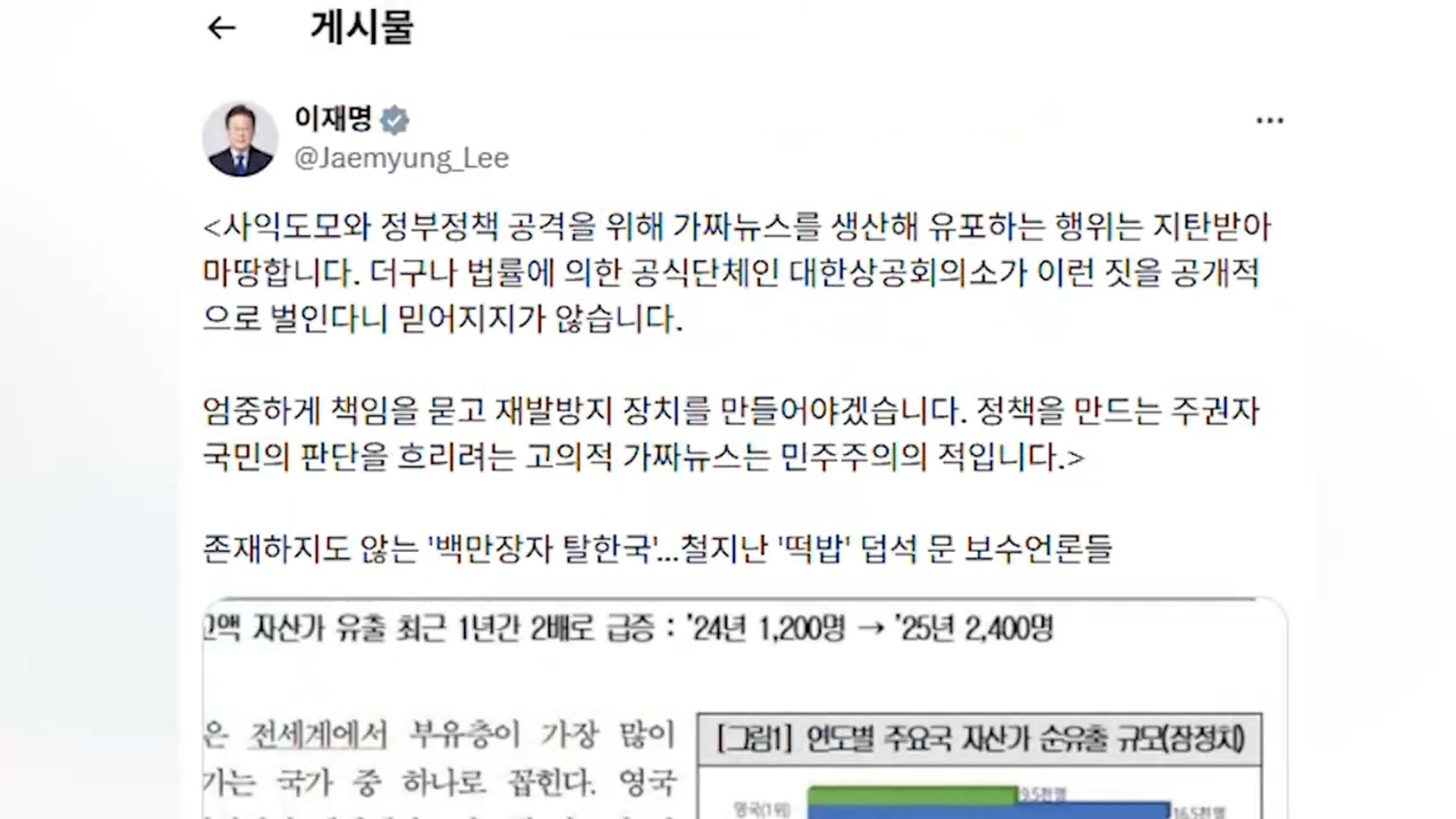 이재명 대통령이 한국의 자산가 탈출 현상이 급증했다는 대한상공회의소 보도자료를 "고의적 가짜뉴스"라고 질타했습니다.