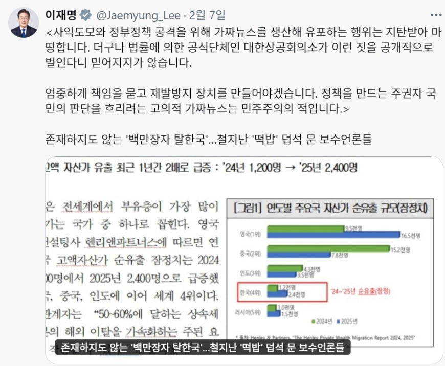 이 대통령은 전날 SNS에 이 기사를 공유하면서 “사익도모와 정부정책 공격을 위해 가짜뉴스를 생산해 유포하는 행위는 지탄받아 마땅하다”고 했다. 그러면서 “엄중하게 책임을 묻고 재발방지 장치를 만들어야겠다”고 했다. 3시간 뒤 대한상의는 사과문을 발표했다.