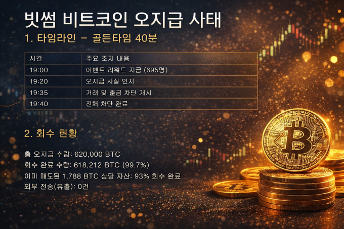 빗썸은 지난 6일 오후 7시 이벤트 리워드 지급 과정에서 직원의 비트코인 수량 입력 실수로 총 695명에게 총 62만 비트코인을 잘못 지급했다. 이는 빗썸이 보유한 비트코인 보유 수량 4만6000개의 12배가 넘는 규모로 60조원에 달하는 가격이다.