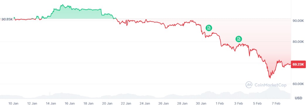 7일(현지시간) 미국 가상자산 정보 플랫폼 코인마켓캡에 따르면 비트코인 가격은 전 거래일 대비 약 1.5% 하락해 6만9000달러(약 1억100만원) 선에서 거래됐다.