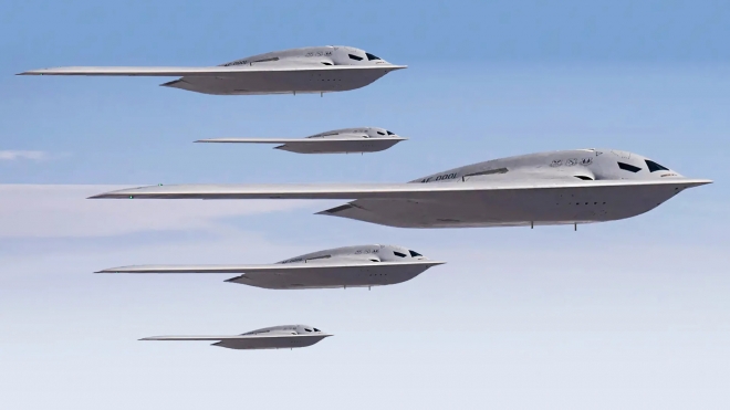 미 공군 차세대 스텔스 폭격기 B-21 ‘레이더’ 편대 비행을 묘사한 합성 이미지. 미 공군·워존 제공 |