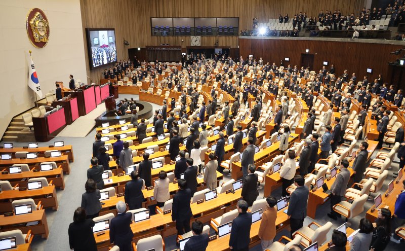 제22대 국회의원들이 2일 오후 서울 여의도 국회에서 열린 제432회국회(임시회) 제1차 본회의 개회식에서 국민의례를 하고 있다. 뉴시스 |