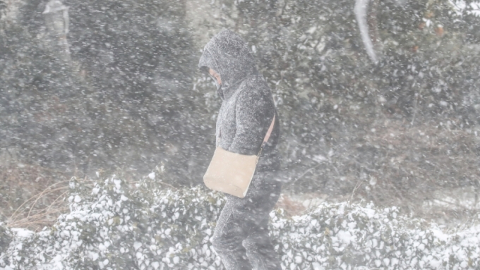 폭설로 제주공항 활주로가 임시 폐쇄된 8일 오전 제주시 용담동에서 한 시민이 눈보라를 맞으며 걸어가고 있다. /사진=뉴시스 |