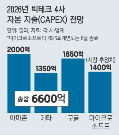 아마존은 지난 5일 올해 자본지출 예상액으로 2000억달러를 제시했다. 지난해 지출액인 1318억달러보다 크게 증가한 규모다. 구글은 최대 1850억달러, 메타는 최대 1350억달러를 전망했다. 마이크로소프트는 구체적 수치를 제시하진 않았지만 2026 회계연도(2025년 7월~2026년 6월) 자본지출이 1400억달러 이상일 것으로 추산된다. 이들 4개 기업의 올해 자본지출은 지난해(4100억달러) 대비 약 60% 늘어난 수준이다.
