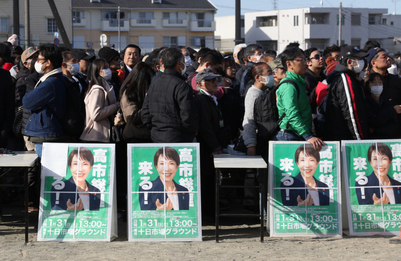 다카이치 사나에 일본 총리가 중의원 선거(총선)를 앞두고 31일 가나가와현 요코하마시에서 실시한 집권 자민당 후보자 지원 유세 현장에서 참가자들이 퇴장 순서를 기다리고 있다. 연합뉴스 |