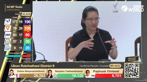 현지 방송 타이PBS에 따르면 이날 오후 10시 50분 기준으로 개표가 52.6% 진행된 가운데 비공식 집계 결과 품짜이타이당이 하원 500석 중 196석(39.2%)을 차지할 것으로 전망됐다.