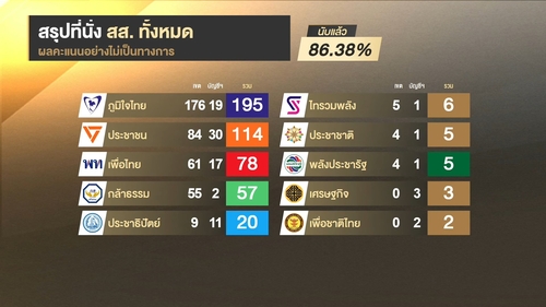 현지 방송 타이PBS에 따르면 이날 오후 11시 51분 기준으로 개표가 86.38% 진행된 가운데 비공식 집계 결과 품짜이타이당이 하원 500석 중 195석(39.0%)을 차지할 것으로 전망됐다.