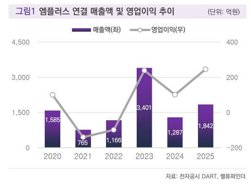 밸류파인더에 따르면 엠플러스는 2025년 연결 기준 매출액 1842억 원, 영업이익 246억 원을 기록했다. 매출액은 전년 대비 43.0%, 영업이익은 143% 증가한 수치다. 영업이익률은 13.4%로 개선됐으며, 주가수익비율(PER)은 7.4배 수준으로 밸류에이션 부담이 크지 않다고 평가했다.
