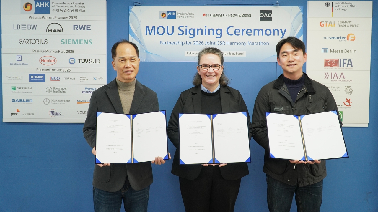 주한독일상공회의소(KGCCI)는 서울특별시시각장애인연합회, 오에이오(OAO)와 함께 스포츠와 기술을 결합한 사회공헌 협력 및 ‘시각장애인과 함께하는 어울림 마라톤’을 위한 3자 업무협약(MOU)을 체결했다고 9일 발표했다.