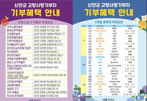 9일 신안군에 따르면 누적 기부액 10만 원 이상인 기부자를 대상으로 군 운영 박물관·미술관 등 문화시설 무료입장, 신안군 주관 각종 행사·축제 초청, 연하장 또는 감사 편지 발송 등의 혜택을 제공한다.