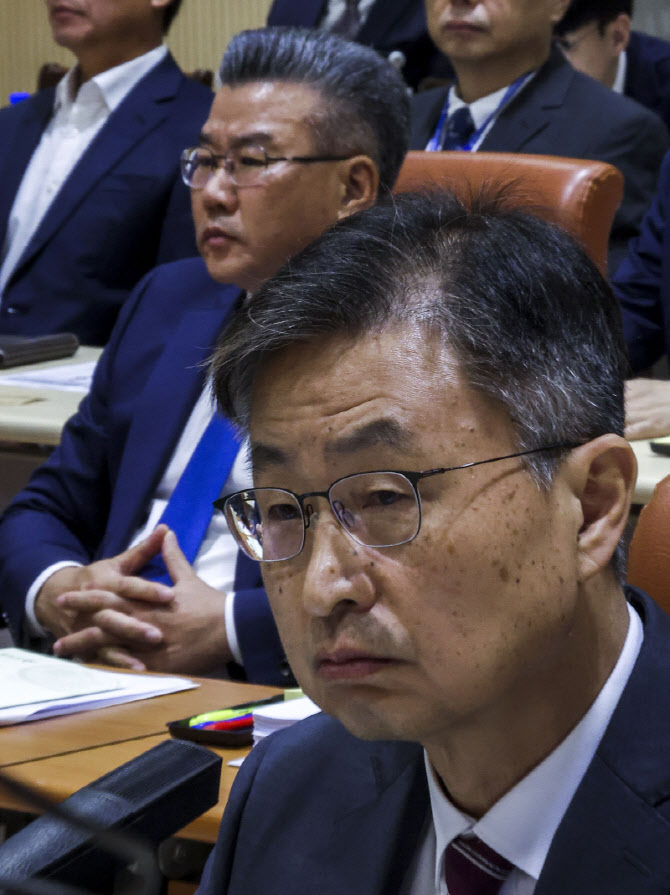 2024년 10월 서울 종로구 감사원에서 열린 국회 법제사법위원회의 감사원 국정감사에 참석한 유병호 감사위원(왼쪽)과 최재해 전 감사원장의 모습(사진=뉴시스) |