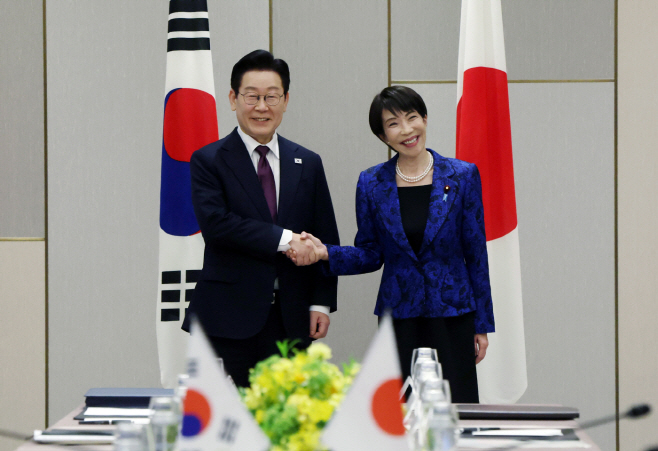 이재명 대통령과 다카이치 사나에 일본 총리가 지난달 13일 일본 나라현 정상회담장에서 확대 회담에 앞서 악수하고 있다. /연합뉴스 |