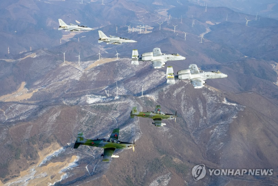 한미공군이 지난해 1월 공군 원주기지에서 공군 대대급 연합공중훈련 쌍매훈련을 실시하고 있다. 사진은 왼쪽부터 한 FA-50 2기, 미 A-10 2기, 한 KA-1 2기. 연합뉴스 |