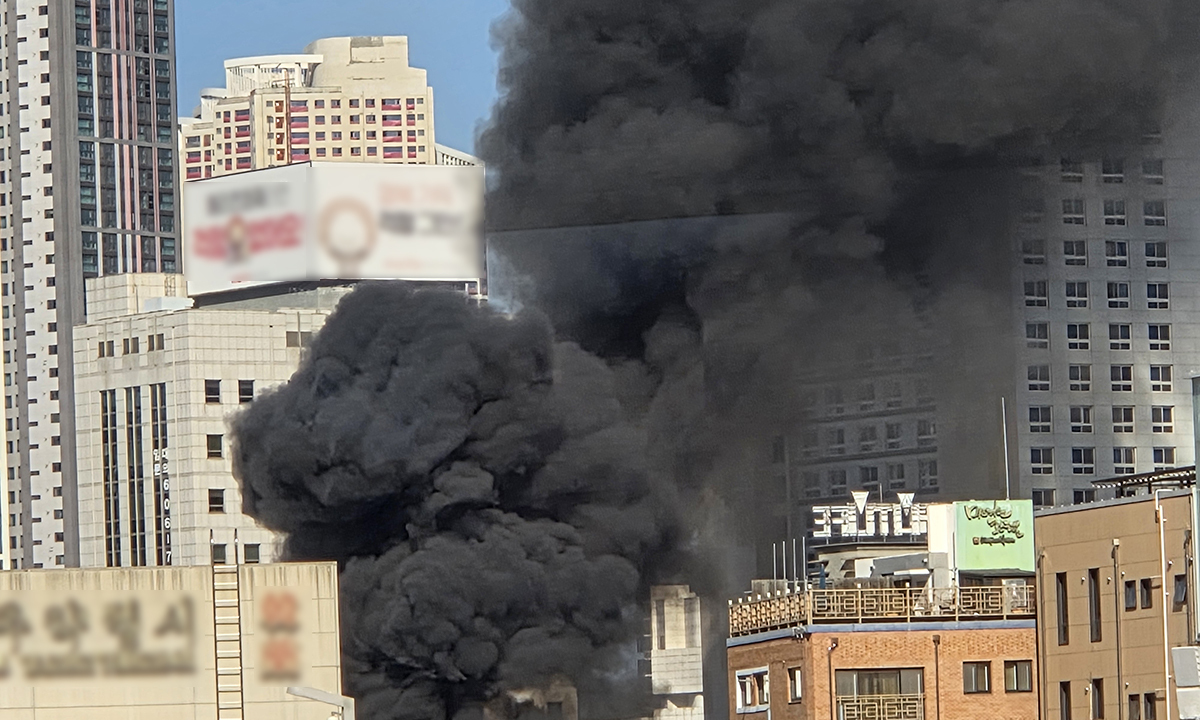 9일 오후 2시3분쯤 대구 중구 종로의 한 건물에서 불이나 검은 연기가 피어오르고 있다. |