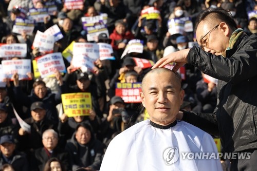 (서울=연합뉴스) 황광모 기자 = 김진태 강원도지사가 9일 국회 본청 앞에서 열린 강원특별법 '3차 개정안' 통과 촉구를 위한 국회 상경 도민 결의대회에서 삭발하고 있다. 2026.2.9 hkmpooh@yna.co.kr |