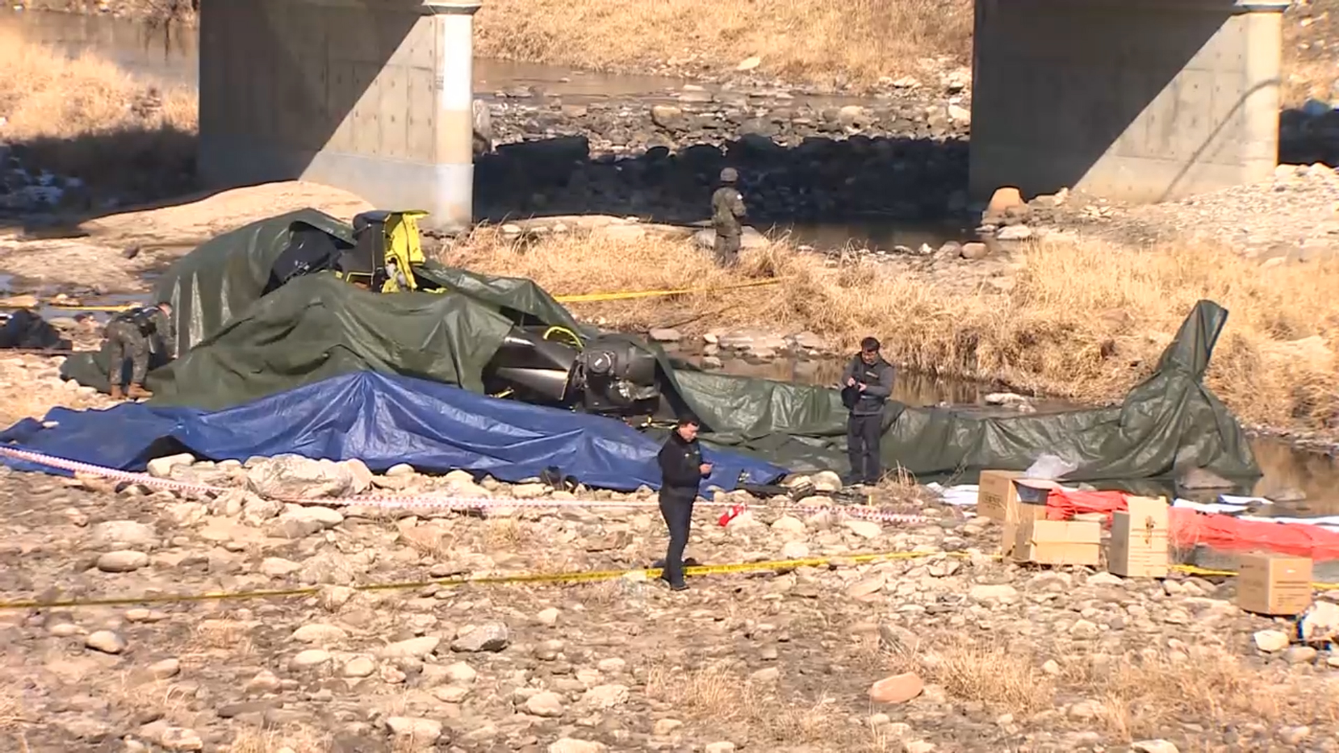 <송채은 기자> "사고 헬기는 하천변으로 추락했는데요. 동체는 방수포로 덮여있습니다."