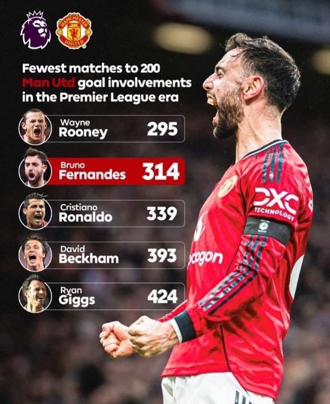 '골닷컴'에 따르면 브루노는 토트넘전을 통해 맨유 유니폼을 입고 프리미어리그 314경기 만에 104골 96도움, 200번째 공격 포인트를 기록했다. 구단 역사상 두 번째로 빠른 기록이다. 브루노보다 앞서 있는 건 295경기에서 133골 67도움을 기록한 웨인 루니다.