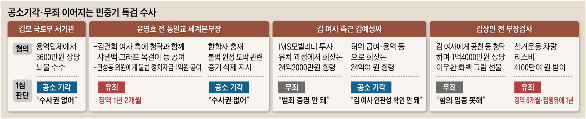 검사장 출신 변호사는 “법원의 연이은 공소 기각과 무죄 판결은 결국 특검 수사가 무리했다는 방증”이라며 “특검이 김 여사 관련 의혹을 규명하기 위해 별건 수사 등 무리수를 두다가 결국 애꿎은 피해자만 만들어낸 셈이 됐다”고 말했다. 또 다른 법조계 인사는 “이 정도면 민 특검팀의 수사와 기소에 심각한 문제가 있었다고 볼 수밖에 없다”면서 “정치적 책임은 물론 법적 책임 논란이 불거질 수 있는 상황”이라고 했다.