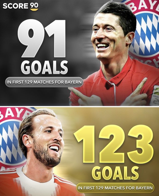 축구 매체 '스코어 90'은 9일 바이에른 뮌헨의 해리 케인이 로베르트 레반도프스키의 득점 기록을 뛰어넘었다며, 그 기록을 공개했다.